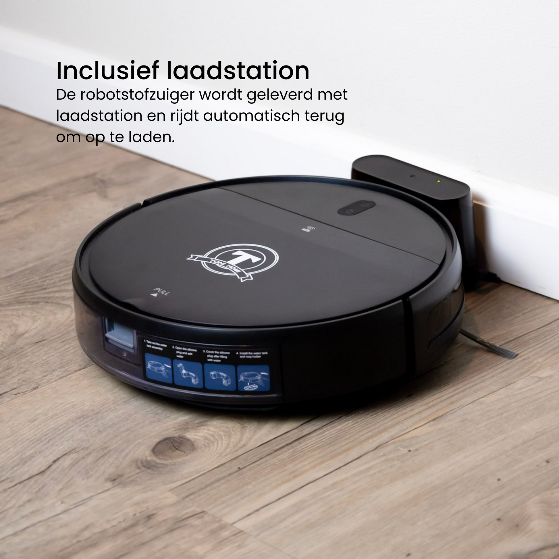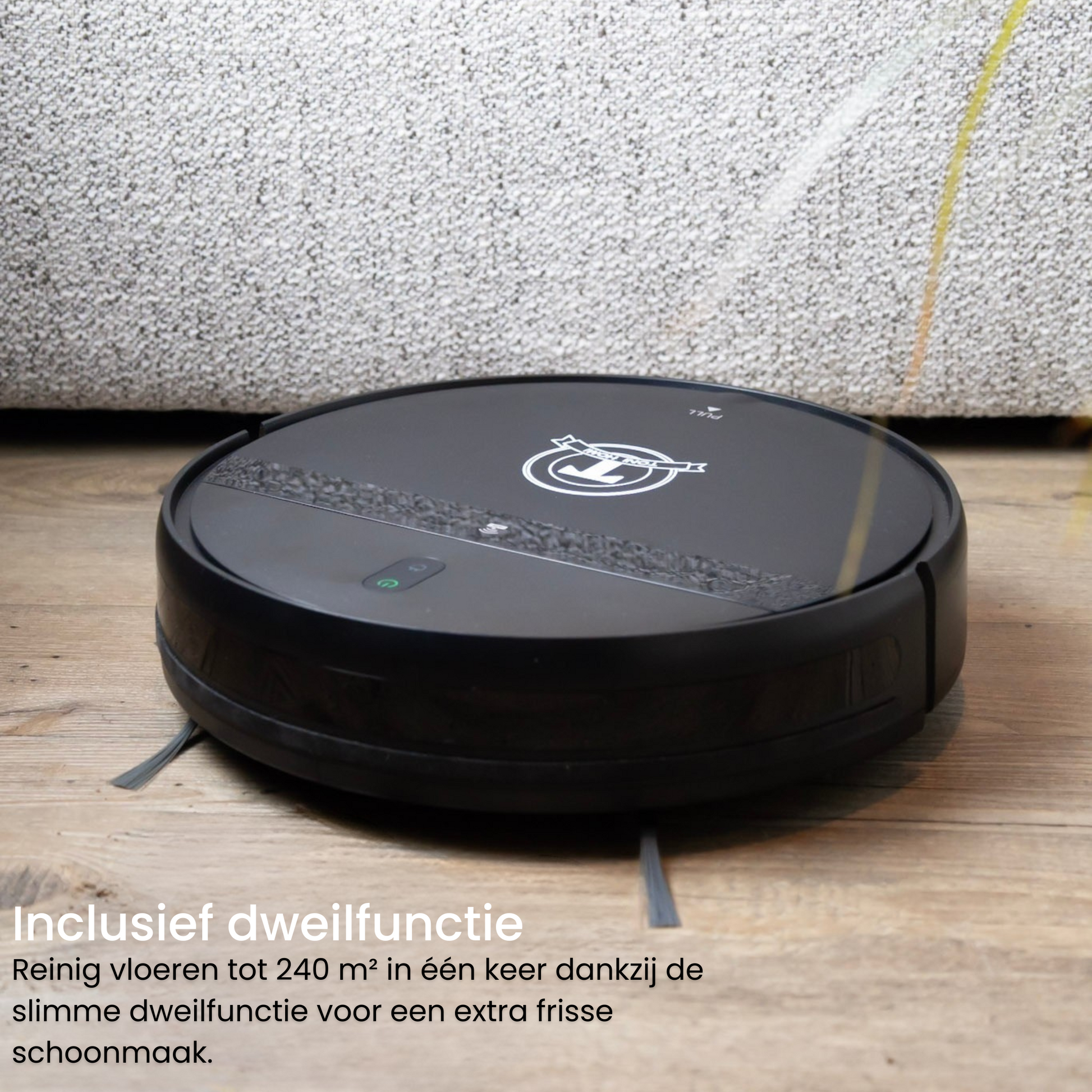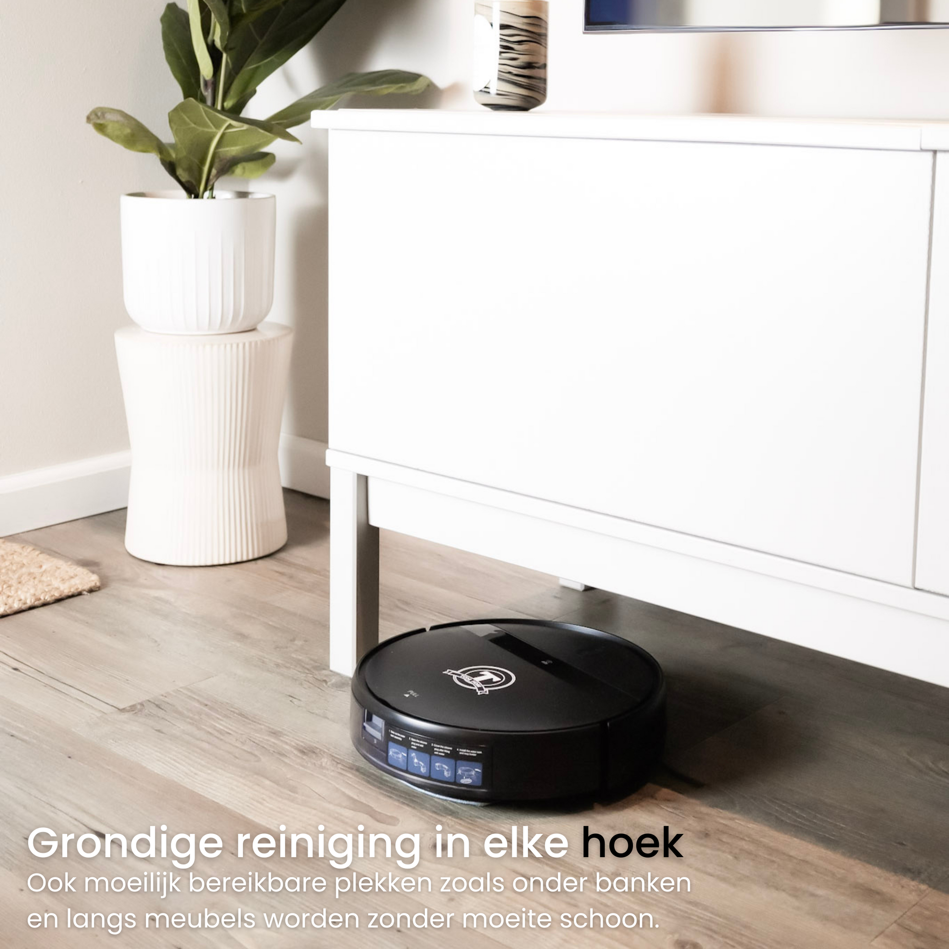 • Automatische werking – Met slimme sensoren navigeert hij door je huis en past hij zich aan obstakels en meubels aan.