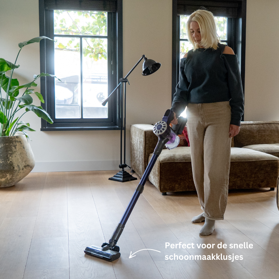 A: De batterij laadt snel op, binnen enkele uren. Na een volle lading kun je tot 60 minuten onafgebroken schoonmaken – ideaal voor een grondige reiniging van je huis.