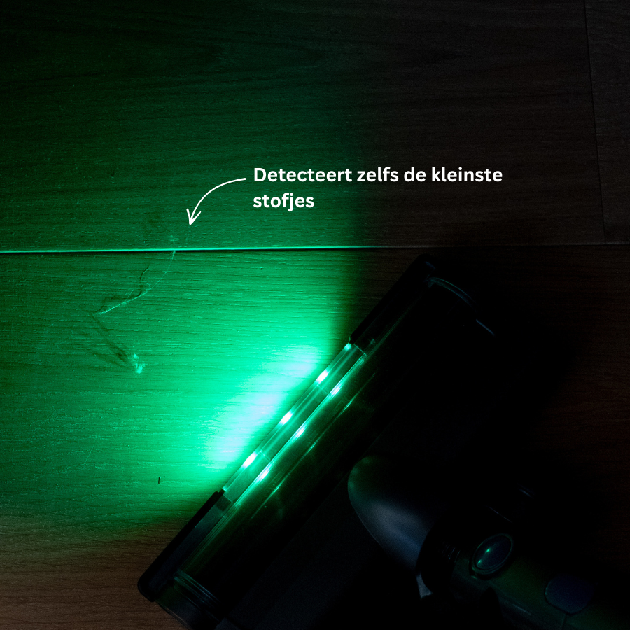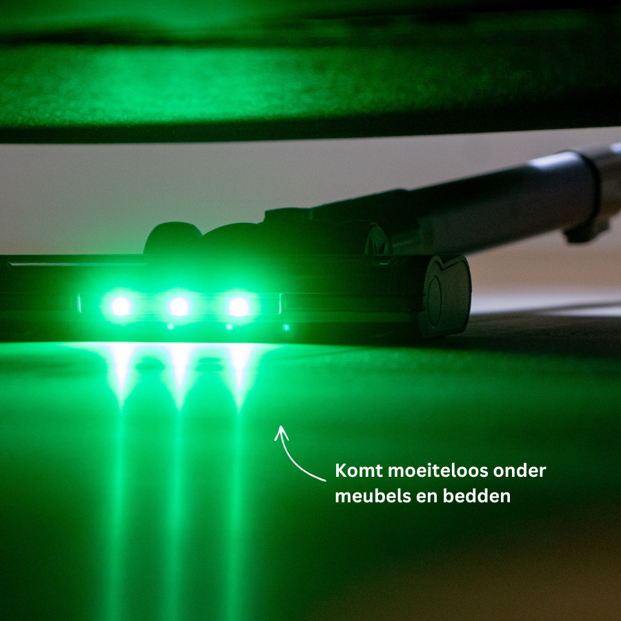 Manoeuvreer de stofzuiger gemakkelijk over tapijten, harde vloeren en krappe ruimtes. Door het scherpe groene licht zie je wat er echt op de vloer ligt. Op deze manier maak je de vloer 100% schoon.